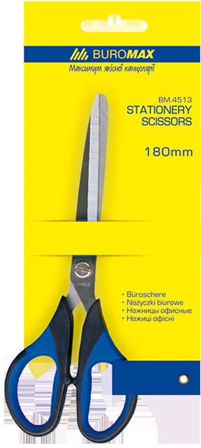 Офисные ножницы BUROMAX: подходят для резки бумаги, картона, фотобумаги, ткани и т.д. у ножниц плавный и мягкий ход резки закругленные лезвия изготовлены из нержавеющей стали, и гарантируют безопасность во время резки ручки выполнены из черного пластика с синими прорезиненными вставками эргономичная форма ручек и прорезиненные вставки обеспечивают комфорт во время работы индивидуальная блистерная упаковка открытого типа длина ножниц: 180 мм Ножницы BUROMAX – это качество и надежность!