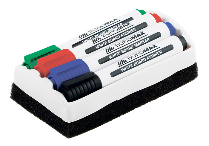 Высококачественный маркер для досок JOBMAX от BUROMAX – отличный выбор для повседневной работы в офисе, школе, дома. Идеально подходит для письма на белых эмалевых досках и других гладких поверхностях. Чернила (черный, синий, зеленый, красный) на водной основе, ложатся ровным слоем и не сворачиваются на гладкой поверхности. Надпись стирается сухой тканью или губкой. Конусообразный пишущий наконечник позволяет писать толщиной линии 2-4 мм. Пластиковый корпус и пластиковый клип на колпачке. Цвет колпачка соответствует цвету чернила. В артикуле ВМ.8800-84 – набор из 4 цветов, есть губка. Маркеры BUROMAX – это всегда качество и удобство!