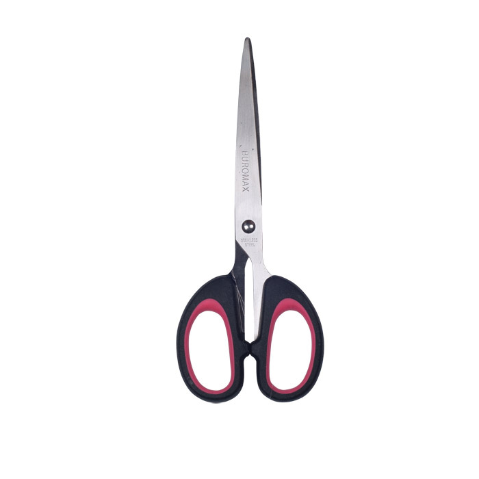 Офисные ножницы “JOBMAX” от BUROMAX: подходят для резки бумаги, картона, фотобумаги, ткани и т.д. у ножниц плавный и мягкий ход резки закругленные лезвия изготовлены из нержавеющей стали, и гарантируют безопасность во время резки цельнометаллический корпус с резиновыми вставками на ручках эргономичная форма ручек и прорезиненные вставки обеспечивают комфорт во время работы цвета резиновых вставок: синий, зеленый, желтый, розовый длина ножниц: 207 мм Ножницы BUROMAX – это качество и надежность!