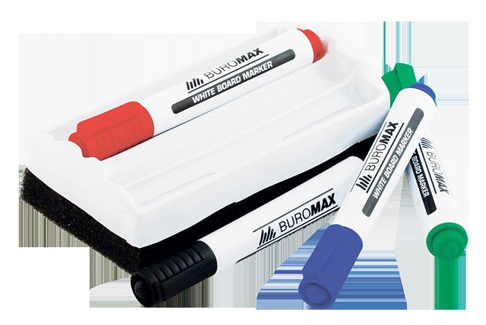 Высококачественный маркер для досок JOBMAX от BUROMAX – отличный выбор для повседневной работы в офисе, школе, дома. Идеально подходит для письма на белых эмалевых досках и других гладких поверхностях. Чернила (черный, синий, зеленый, красный) на водной основе, ложатся ровным слоем и не сворачиваются на гладкой поверхности. Надпись стирается сухой тканью или губкой. Конусообразный пишущий наконечник позволяет писать толщиной линии 2-4 мм. Пластиковый корпус и пластиковый клип на колпачке. Цвет колпачка соответствует цвету чернила. В артикуле ВМ.8800-84 – набор из 4 цветов, есть губка. Маркеры BUROMAX – это всегда качество и удобство!
