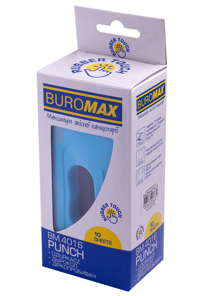 Металлическая подошва, пластиковый прорезиненный рычаг Rubber touch Контейнер для конфетти Пробивная мощность: до 10 листов бумаги 80 г / м2 Диаметр отверстия: 5,5 мм Межцентровое расстояние: 80 мм Выдвижная линейка с форматной шкалой Картонная упаковка с окошком, европодвес