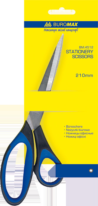 Ножницы офисные BUROMAX – Ваш помощник при резки бумаги, картона, фотобумаги, ткани и т.д.! Обеспечивают плавный и мягкий ход резки! Лезвия изготовлены из высококачественной нержавеющей стали, а их закругленность гарантирует безопасность во время резки. Ручки выполнены из качественного пластика черного цвета с прорезиненными синими вставками ( Ваше удобство в работе). Эргономичная форма ручек обеспечивает комфорт во время работы. Серия представлены 2 позициями (размеры). Упакованы в индивидуальную блистерная упаковка открытого типа. Ножницы офисные BUROMAX – качество Вам гарантированно!