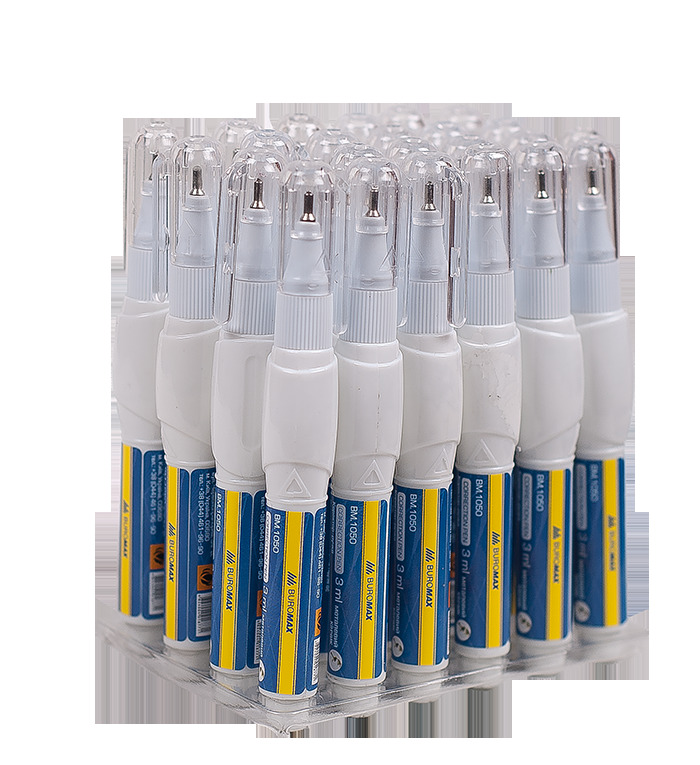 Корректирующая ручка JOBMAX от BUROMAX – подходит даже для мелких и точечных исправлений! Удобна, проста и безопасна в использовании быстросохнущая жидкость, обладает высокой корректирующей способностью. Пластиковый корпус с пластиковым наконечником и дозатором для точного нанесения корректора. Дозатор регулирует интенсивность подачи корректирующей жидкости и предотвращает преждевременное её высыхание. Корректирующая жидкость на масляной основе – быстро сохнет на бумаге, а во флаконе максимально долго не подсыхает и остается пригодной к использованию, срок годности - 24 месяца. Металлический шарик для взбалтывания внутри корпуса. Пластиковый колпачок с клипом.
