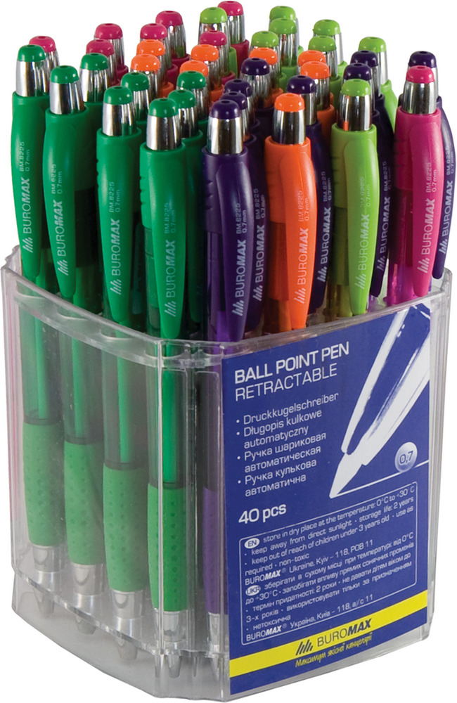 Шариковая ручка JOBMAX от BUROMAX – для офиса, школы и дома. Корпуса ручек серии выполнены из прозрачного тонированного пластика ярких цветов и оснащены резиновым грипом. резиновый грип в цвет корпуса - препятствует возникновению мозолей на пальцах и обеспечивает комфортное письмо чернила на водной основе для мягкого и легкого письма клип для крепления ручки в цвет корпуса цвет чернила: синий цветовое решение корпуса: фиолетовый, розовый, оранжевый, салатовый сменный стержень 40 шт. упакованы в пластиковою тубу. Ручки BUROMAX – отличный пишущий инструмент на каждый день!