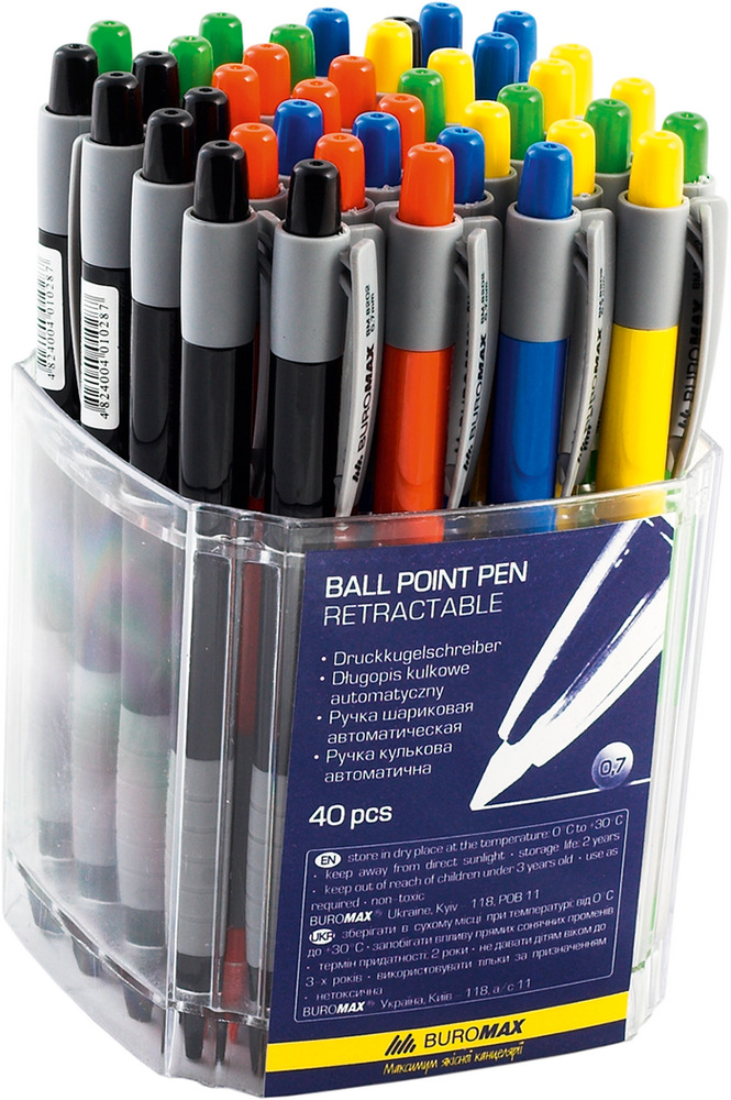 Шариковая ручка JOBMAX от BUROMAX – для офиса, школы и дома. Корпуса ручек серии выполнены из пластика и оснащены резиновым грипом серого цвета. резиновый грип серого цвета - препятствует возникновению мозолей на пальцах и обеспечивает комфортное письмо чернила на водной основе для мягкого и легкого письма клип серого цвета для крепления ручки цвет чернила: синий цветовое решение корпуса: синий, салатовый, желтый, оранжевый, черный сменный стержень 40 шт. упакованы в пластиковою тубу. Ручки BUROMAX – отличный пишущий инструмент на каждый день!
