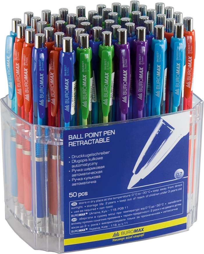 Шариковая ручка JOBMAXот BUROMAX – для офиса, школы и дома. Корпуса ручек серии выполнены из прозрачного тонированного пластика ярких цветов и оснащены резиновым грипом. В дизайне присутствуют металлизированные элементы, что делает каждую ручку коллекции как функциональным, так и стильным аксессуаром. резиновый грип в цвет корпуса - препятствует возникновению мозолей на пальцах и обеспечивает комфортное письмо чернила на водной основе для мягкого и легкого письма клип для крепления ручки в цвет корпуса цвет чернила: синий цветовое решение корпуса: фиолетовый, красный, голубой, салатовый, синий сменный стержень 50 шт. упакованы в пластиковою тубу. Ручки BUROMAX – отличный пишущий инструмент на каждый день!