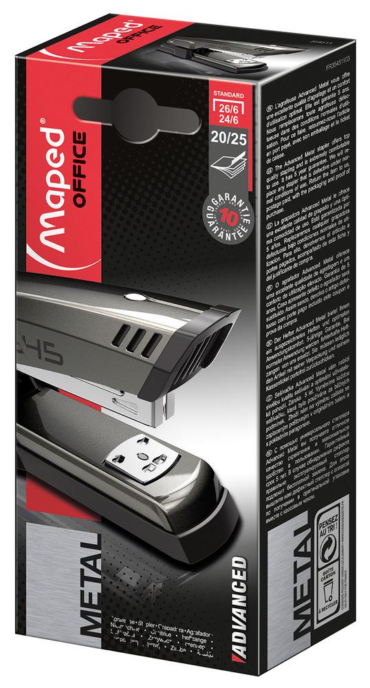 металлический корпус с пластиковыми вставками максимальное количество сшиваемых листов: режимы закрытого, прямого и открытого сшивания механизм защиты от заклинивания скоб открывается на 180° для удобной заправки скобами встроенный контейнер для скоб на 2 пластины оптимизированная для торгового зала упаковка: вертикальное изображение и подвес для крепления на крючке, горизонтальное изображение для размещения на полке металлический механизм вместимость контейнера для скоб: 100шт. №24/6, 140шт. №26/6 глубина закладки бумаги - 52 мм гарантия: 10 лет тип упаковки: коробка с подвесом