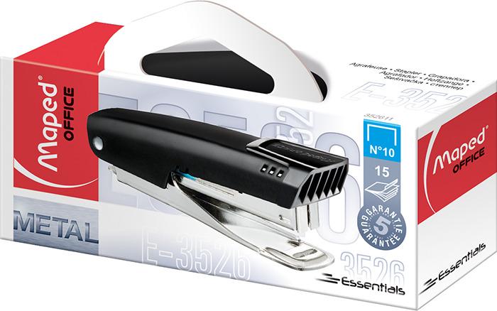 металлический корпус с пластиковыми вставками максимальное количество сшиваемых листов: 15 со встроенным антистеплером вместимость контейнера для скоб: 88 шт. №10 глубина закладки бумаги: 40 мм. цвет: черный гарантия: 5 лет тип упаковки: коробка с подвесом