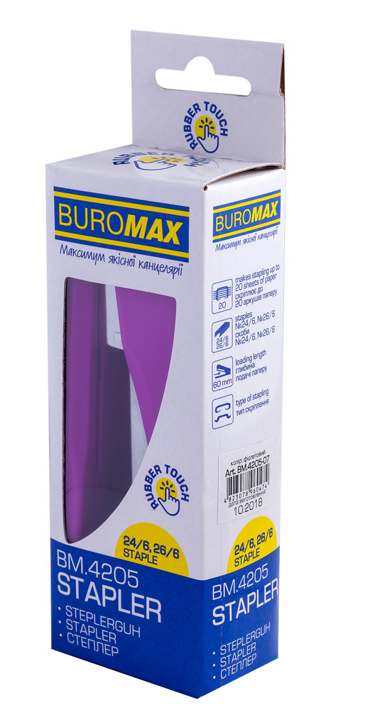 Корпус пластикового степлера BUROMAX изготовлен из пластика c покрытием Rubber Touch. Rubber Touch - бархатистое прорезиненное покрытие, которое обеспечивает приятные тактильные ощущения и максимальный комфорт во время работы. Степлер скрепляет заявленное количество листов (20 л. бумаги 80 г/м²) и даже больше, подходит для ежедневного использования как дома, так и в офисе. Материал: пластик Пробивная мощность: 20 листов Цвета: черный, синий, фиолетовый, серый, розовый, голубой Тип скрепления: закрытый, прямой, открытый Скоба: №24/6, №26/6 Глубина закладки бумаги: 65 мм Размеры степлера: 132х59х36мм Степлеры BUROMAX – надежность, функциональность и удобство!