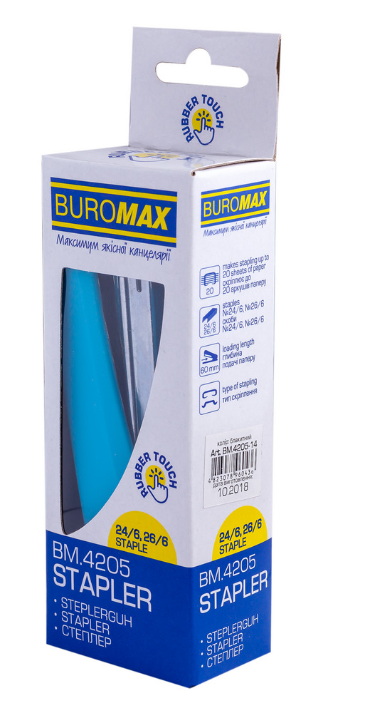Степлер пластиковый "RUBBER TOUCH" BUROMAX, 20 листов, (скобы №24; 26), голубой