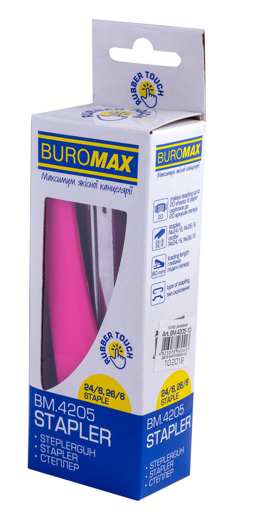 Корпус пластикового степлера BUROMAX изготовлен из пластика c покрытием Rubber Touch. Rubber Touch - бархатистое прорезиненное покрытие, которое обеспечивает приятные тактильные ощущения и максимальный комфорт во время работы. Степлер скрепляет заявленное количество листов (20 л. бумаги 80 г/м²) и даже больше, подходит для ежедневного использования как дома, так и в офисе. Материал: пластик Пробивная мощность: 20 листов Цвета: черный, синий, фиолетовый, серый, розовый, голубой Тип скрепления: закрытый, прямой, открытый Скоба: №24/6, №26/6 Глубина закладки бумаги: 65 мм Размеры степлера: 132х59х36мм Степлеры BUROMAX – надежность, функциональность и удобство!