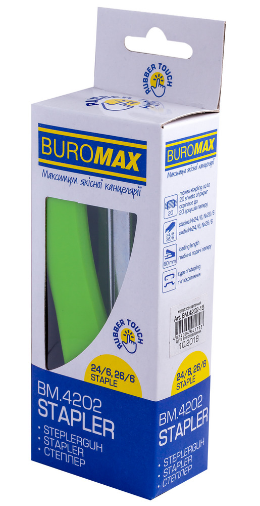 Степлер пластиковый "RUBBER TOUCH" BUROMAX, 20 листов, (скобы №24; 26), светло-зеленый