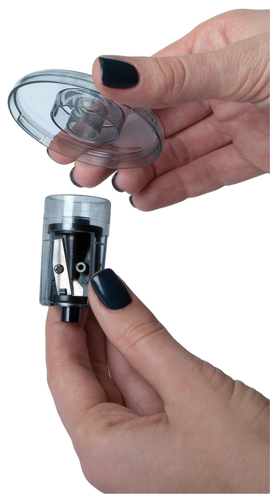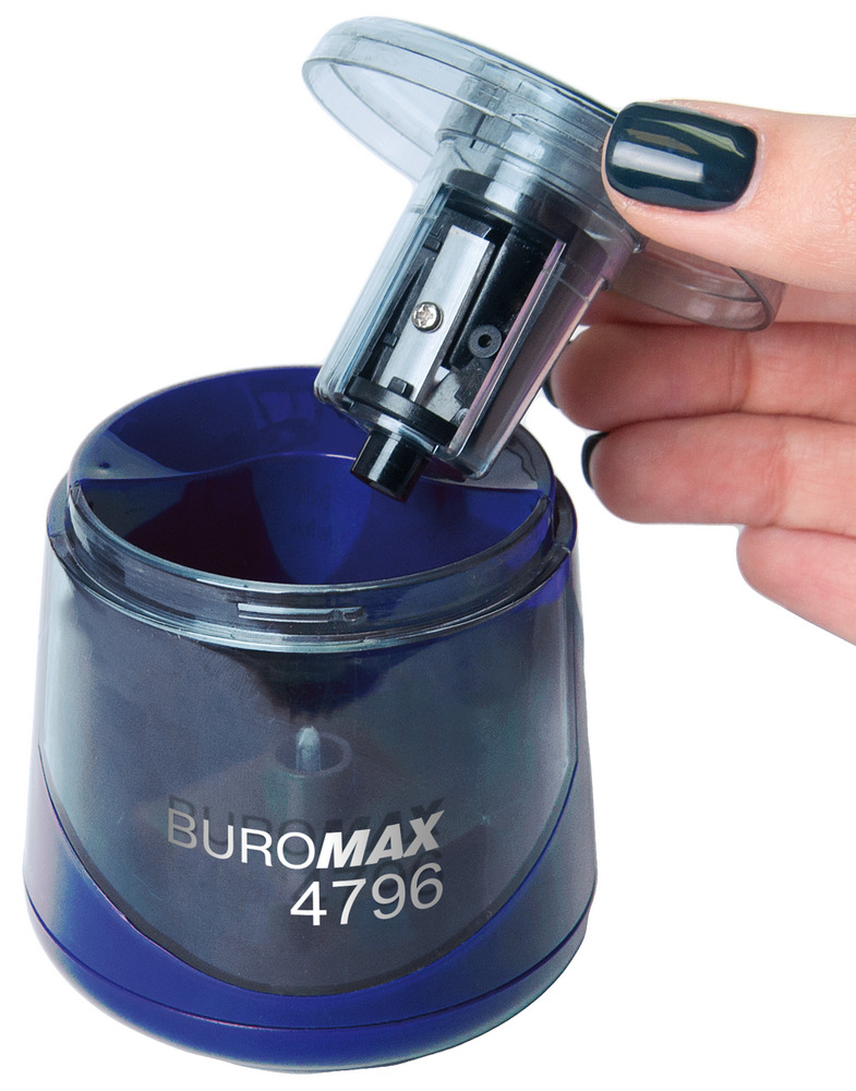 Автоматическая точилка ТМ BUROMAX - качественная заточка карандашей стала еще проще. Подойдет для чорнографитных и цветных карандашей (6,5 - 8 мм в диаметре). Не занимает много места. Инновационная точилка станет полезным помощником на рабочем месте школьника, студента, офисного работника. • стальное лезвие, работает от 2-х элементов питания АА 1,5V; • поставляется без батареек, в комплекте сменное лезвие; • прочный пластиковый корпус; • одно отверстие, с контейнером для стружки; • цвет: синий; • инструкция по использованию и замены лезвия на упаковке; • упакована в картонную коробку.