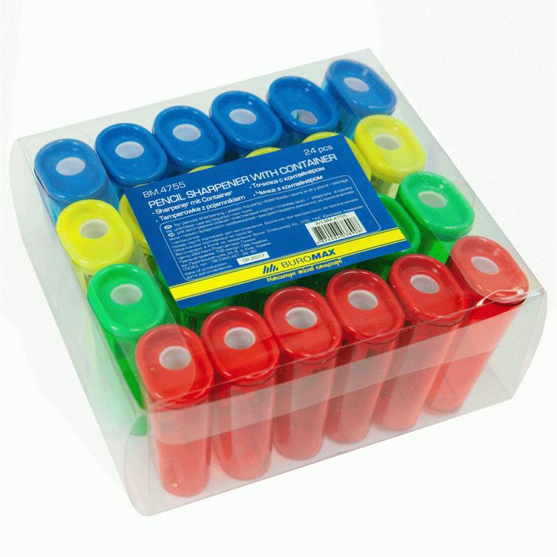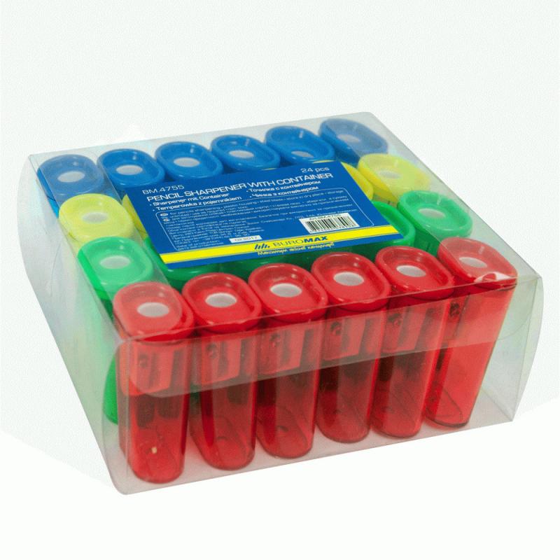 Точилка BUROMAX- простой и надежный способ заточить карандаш. Подходит для офиса, школы и дома. тонированный контейнер для стружки корпус изготовлен из пластика лезвие из инструментальной стали цвета: желтый, зеленый, красный, синий точилки упакованы в пластиковый контейнер по 72 штуки (ассорти) Точилки BUROMAX– это качество и надежность!