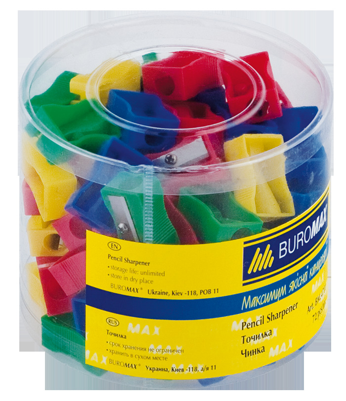 Точилка BUROMAX- простой и надежный способ заточить карандаш. Подходит для офиса, школы и дома. корпус изготовлен из пластика с выемками для пальцев лезвие из инструментальной стали цвета: желтый, зеленый, красный, синий точилки упакованы в пластиковую тубу по 72 штуки (ассорти) Точилки BUROMAX– это качество и надежность!