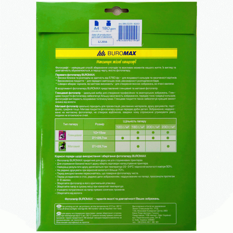 Матовая двухсторонняя фотобумага высшего качества BUROMAX. Идеально подходит для струйной фотопечати любительского уровня, а также, для повседневных проектов в области фотопечати. Мгновенно высыхающая фотобумага позволяет максимально быстро работать со снимками. Матовая ровная поверхность, обеспечивает высокий контраст, отсутствие бликов, отпечатков пальцев на нанесенном изображении. Специальное микропористое покрытие обеспечивает высочайшее разрешение (до 5760 dpi).