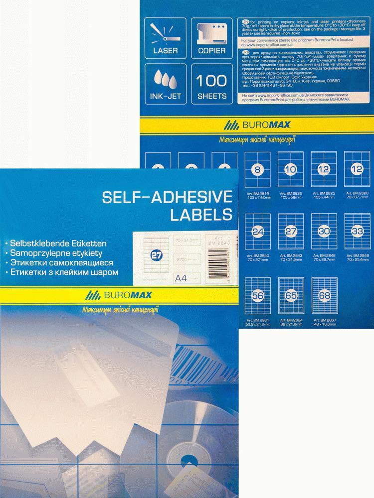 Этикетки самоклеящиеся BUROMAX – представляют собой готовые этикетки белого цвета различных размеров на листах формата А4. Они изготовлены из самоклеящиеся бумаги созданной специально для печати на струйных принтерах и копировальных аппаратах. Сферы широкого применения: наклейки со штрих-кодом; информационные наклейки на товары; маркировочные наклейки на коробки, упаковки, емкости; печать адресных наклеек на почтовые конверты и пакеты; ценники на товары.