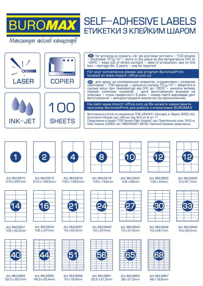 Этикетки самоклеящиеся BUROMAX – представляют собой готовые этикетки белого цвета различных размеров на листах формата А4. Они изготовлены из самоклеящиеся бумаги созданной специально для печати на струйных принтерах и копировальных аппаратах. Сферы широкого применения: наклейки со штрих-кодом; информационные наклейки на товары; маркировочные наклейки на коробки, упаковки, емкости; печать адресных наклеек на почтовые конверты и пакеты; ценники на товары.