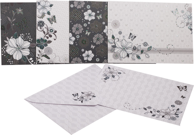 Набор для создания оригинальных открыток (скрапбукинга). Состав набора: 8 конвертов (10.9*15.2 см), 8 открыток размером 10.5*14.8 см (по 2 шт. с глиттером и без глиттера в 4 дизайнах). Плотность основ для открыток 220 г/м2. Плотность конвертов 100 г/м2. С помощью набора Вы сможете оформить 8 открыток и разместить их в цветных конвертах соответствующего дизайна.