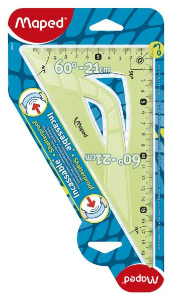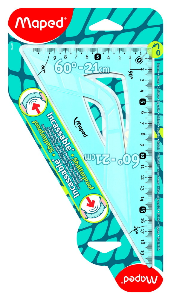 ударостойкий гибкий пластик, не ломается при изгибе, не сломается в школьном рюкзаке с удобным держателем шкала на обоих катетах начинается от самого края угольника высокое качество градуировки: шкала нанесена с использованием ультрафиолетовой печати для лучшей стойкости цвет: голубой или салатовый полупрозрачный упаковка: блистер