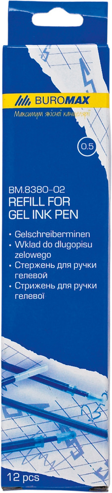 Стержень гелевый BUROMAX чернило на водной основе, которое обеспечивает мягкое и легкое письмо 5 цветов чернила: черный, синий, фиолетовый, зеленый, красный каждый стержень упакован в индивидуальный пакетик с завесом 12 шт. упакованы в картонную коробку.