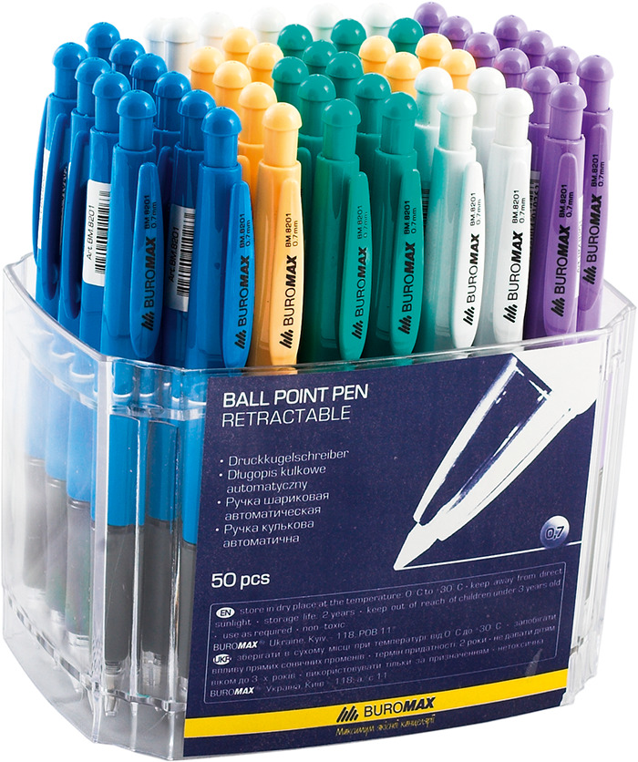 Шариковая ручка JOBMAX от BUROMAX – для офиса, школы и дома. Корпуса ручек серии выполнены из пластика пастельных модных тонов и оснащены резиновым грипом. резиновый грип в цвет корпуса - препятствует возникновению мозолей на пальцах и обеспечивает комфортное письмо чернила на водной основе для мягкого и легкого письма клип для крепления ручки цвет чернила: синий цветовое решение корпуса: синий, зеленый, желтый, сиреневый, белый сменный стержень 50 шт. упакованы в пластиковою тубу. Ручки BUROMAX – отличный пишущий инструмент на каждый день!
