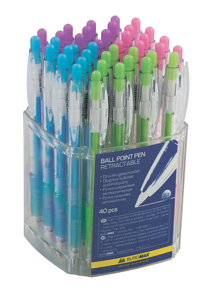 Шариковая ручка JOBMAX от BUROMAX – для офиса, школы и дома. Корпуса ручек серии выполнены из прозрачного цветного пластика и оснащены резиновым грипом. резиновый грип в цвет корпуса - препятствует возникновению мозолей на пальцах и обеспечивает комфортное письмо чернила на водной основе для мягкого и легкого письма клип для крепления ручки цвет чернила: синий цветовое решение корпуса: фиолетовый, розовый, голубой, салатовый сменный стержень 40 шт. упакованы в пластиковою тубу. Ручки BUROMAX – отличный пишущий инструмент на каждый день!