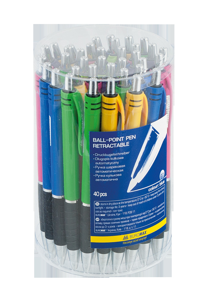Шариковая ручка JOBMAXот BUROMAX – для офиса, школы и дома. Корпуса ручек серии выполнены из пластика нежных пастельных цветов и оснащены резиновым грипом черного цвета. резиновый грип черного цвета для комфортного письма и препятствует возникновению мозолей на пальцах чернила на водной основе для мягкого и легкого письма клип для крепления ручки в цвет корпуса цвет чернила: синий цветовое решение корпуса: желтый, синий, фиолетовый, розовый, зеленый сменный стержень 40 шт. упакованы в пластиковою тубу Ручки BUROMAX – отличный пишущий инструмент на каждый день!